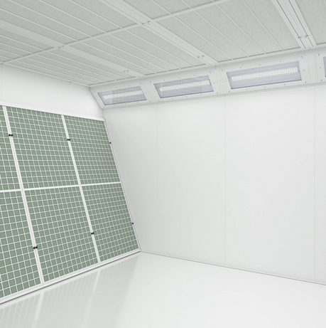 Die Absaugung in der Wand lässt im Inneren der Anlage einen semivertikalen Fluss entstehen, der die absteigende Luft vom Plenum mit der Lösung der teilweisen Filterung oben beschleunigt, um so hohe Standards in Sachen Abkühlung von Overspray, Dunst und Pulver zu garantieren.